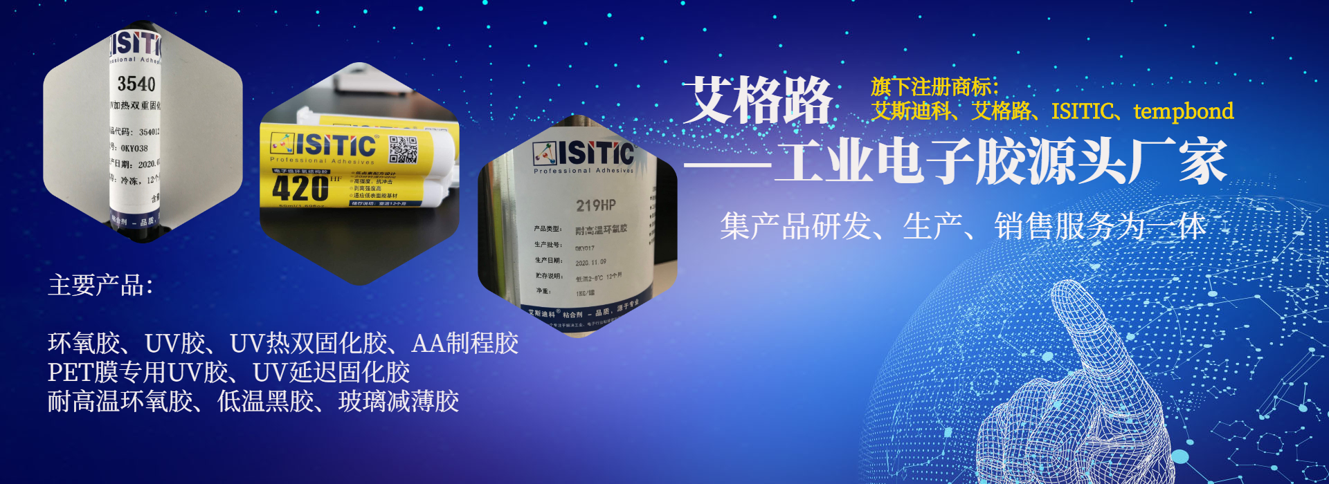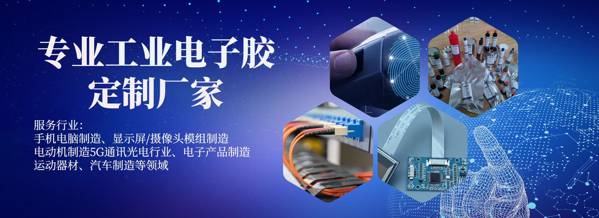 為客戶(hù)提供環(huán)氧膠、UV膠、臨時(shí)粘接膠、UV加熱雙固化膠、丙烯酸結(jié)構(gòu)膠等工業(yè)電子用膠解決方案